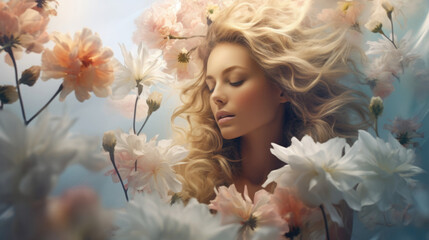Abstract contemporary art collage portrait of young woman with flowers on face