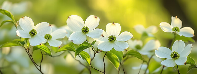 A radiant spring banner of flowering dogwood trees with vivid blossoms and vibrant green leaves under golden sunlight
