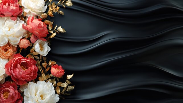 A stunning floral composition featuring a variety of colorful blooms arranged elegantly on a smooth black surface, emphasizing contrast and natural beauty in artistic design.
