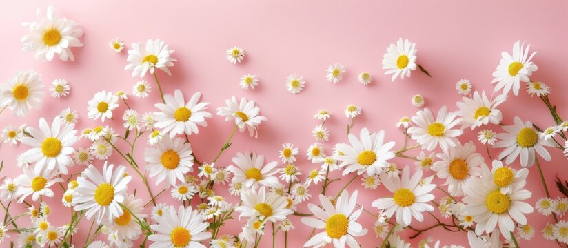 White daisies scattered across a soft pink background with varying sizes creating a dreamy floral pattern for spring or summer themes.