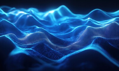 Abstract digital waves of vibrant blue light flowing across a dark background, soft glowing edges and smooth gradients creating a futuristic effect,