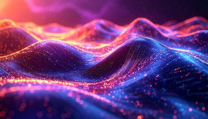 Futuristic blue digital waves flowing across a virtual landscape, representing artificial intelligence, data analysis, and modern technology innovations.