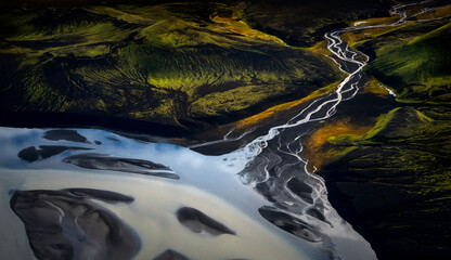 Aerial view of water formation at river estuary in Iceland highlands.