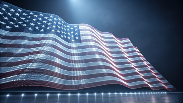 A digital representation of the American flag, flowing gracefully with illuminated details against a dark background.