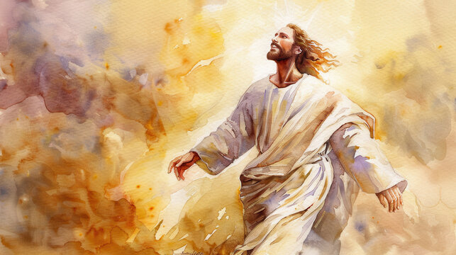 Woman raising arms into radiant light wearing flowing beaded robe spiritual ethereal