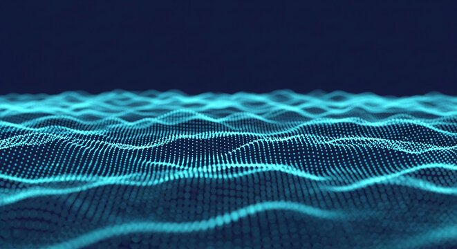 Flowing cyan data wave with glowing binary stream in deep digital space