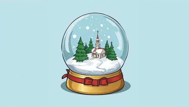 Hand drawn snow globe featuring church and evergreen trees on red ribboned gold base