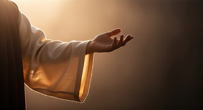 Outstretched hand in flowing robe, illuminated by soft golden light, symbolizes divine presence, offering hope and guidance in a serene spiritual atmosphere