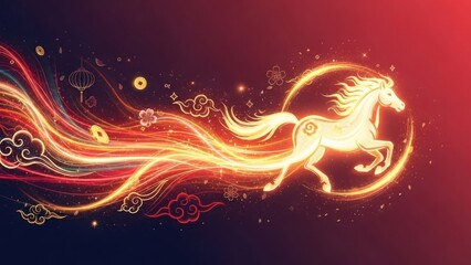 A golden horse with flowing red and gold trails against a dark red background with Chinese symbols and decorations.