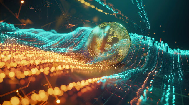 A vibrant digital abstract featuring flowing lines and glowing Bitcoin symbols against a dark background.