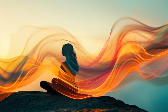 A mystical silhouette of a person with dynamic, flowing fabric against a sunset, symbolizing freedom and creativity