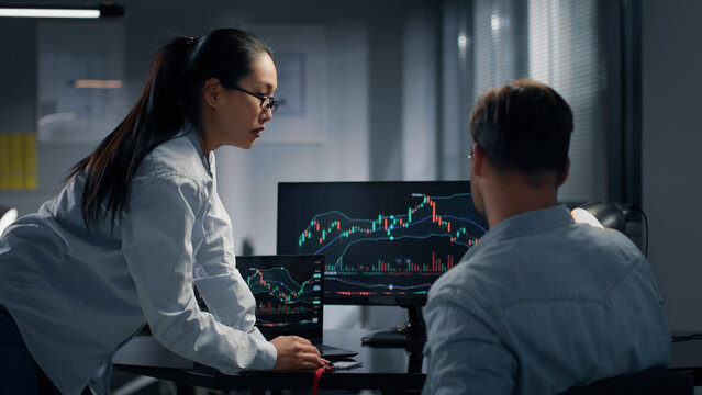 Back view of colleagues discuss financial graphs on computer in office
