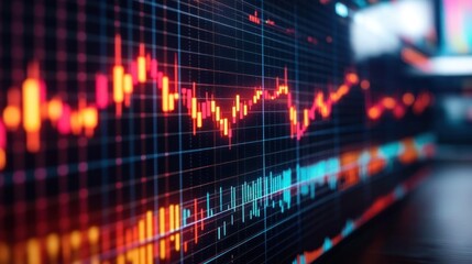 Close-up view of colorful digital stock chart with fluctuating candlestick patterns and volume bars on illuminated screen in a trading environment
