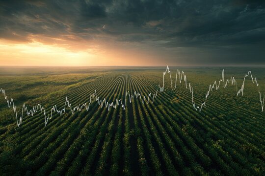 Aerial view of a cultivated field overlaid with a fluctuating white line