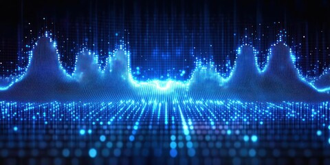 Bright blue glowing digital waveforms and particle grid fluctuating in a futuristic data visualization landscape emitting light and energy