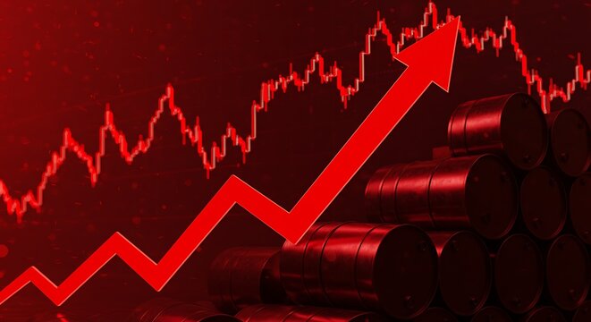 Rising oil prices illustrated by a red arrow graph over stacked oil barrels signifying market growth