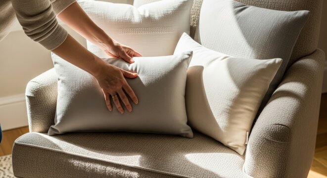 Person fluffing pillows on a beige armchair in a bright room.
