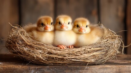 A charming line-up of fluffy ducklings strolls through the lush green grass, basking in the warm sunlight, exemplifying innocence and joyful exploration of nature.