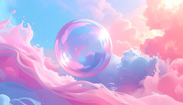 A pastel-colored digital artwork of a large bubble floating amidst wavy lines and fluffy clouds