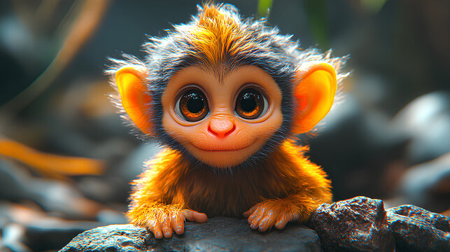 A cute, cartoonish monkey with large eyes and fluffy fur, sitting on a rocky surface.
