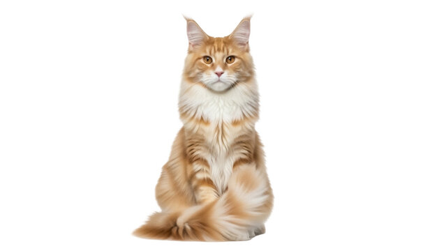 Isolated red tabby Maine Coon cat sitting up straight against a neutral backdrop studio shot