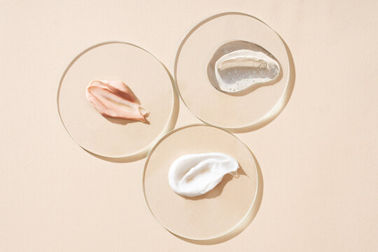 Cosmetic background, smears of cream on glass, texture of cream on a pastel beige background.
