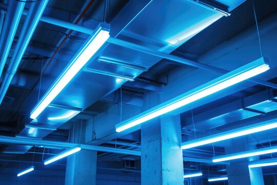 A close up of a double fluorescent light fixture with a bright blue glow on a black background
