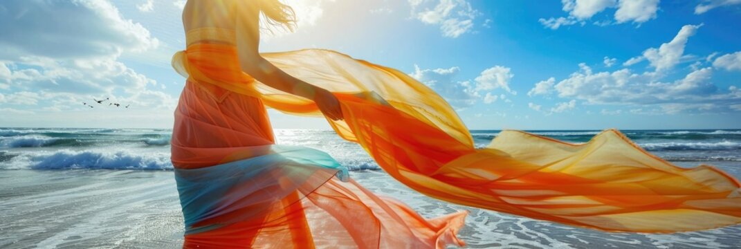 Colorful sarong billowing and fluttering in the gentle coastal breeze The vibrant fabric undulates with a graceful,ethereal movement,creating a sense of fluidity