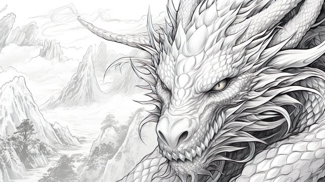 Impeccably sketched dragon portrait capturing intricate details, placed against a serene mountainous landscape