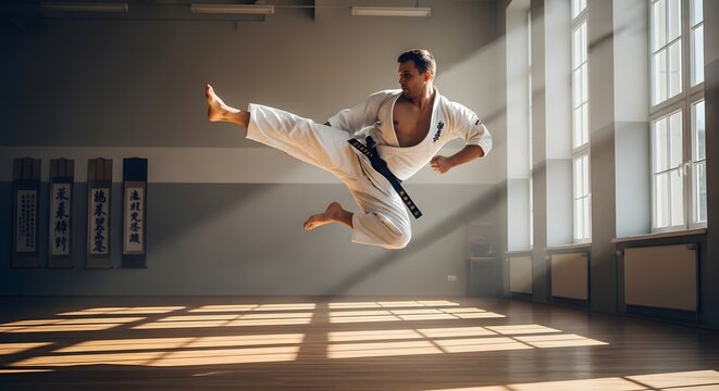 Martial artist in mid - air performing a flying kick embodying skill focus and discipline in a sunlit training space