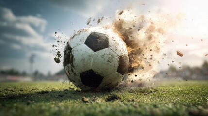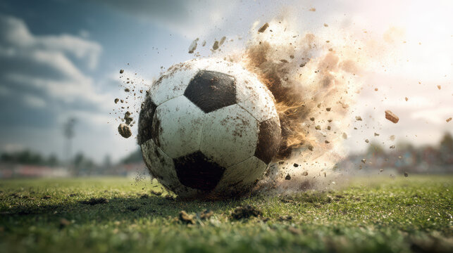 Energetic soccer kick on lush green field with sunlit action