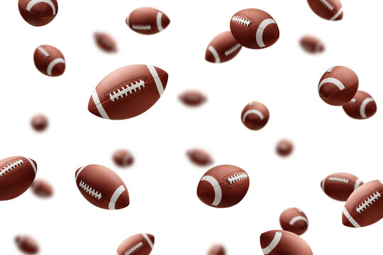 Many American football balls flying on white background