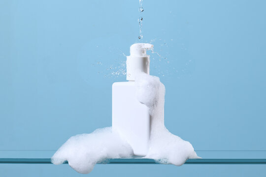 Transparent liquid soap dispenser stands beside bubbling foam with water splashing dramatically in a soft, neutral color palette.