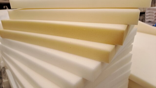 Stacked sheets of yellowed foam rubber for furniture production in factory workshop