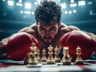 A powerful image of a boxer with red gloves analyzing a chessboard, set under bright arena lights, suggesting a blend of physical prowess and strategic thinking.