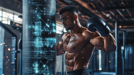 Boxer training in gym with digital data overlay, focusing on performance metrics