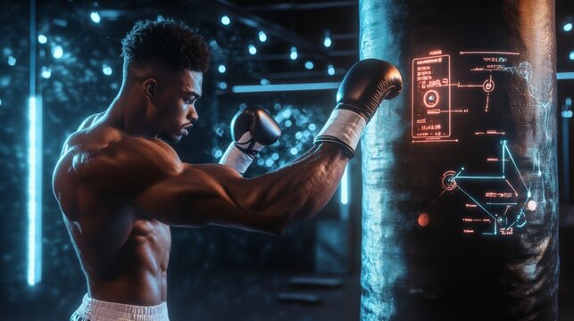 Boxer training with a high-tech punching bag that records impact strength and speed, with a digital coach analyzing and offering improvement.
