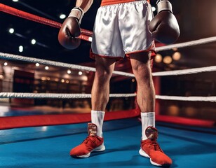 Boxer preparing tying laces in boxing ring ready for match