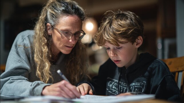 A woman with curly brown hair helps a young boy with homework at a wooden table. The boy has short brown hair and looks focused on his work.