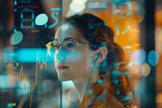 professional woman sits in a modern office, intently gazing at a digital display filled with data and graphics