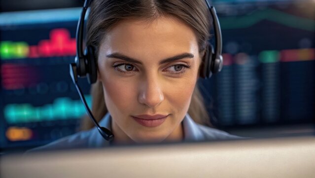Young woman wearing headset at computer desk viewing analytics chart, focused and professional