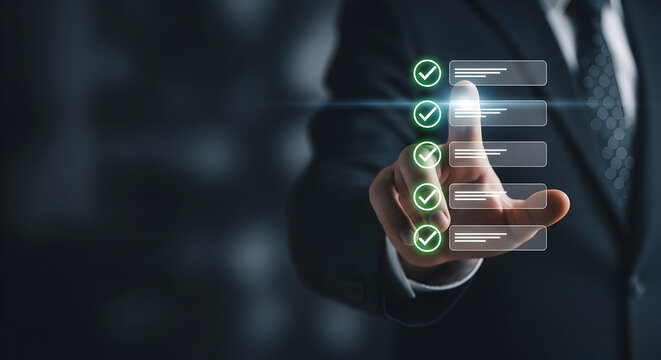 A focused businessman confirming tasks on a digital checklist, demonstrating efficiency and project management in a modern corporate environment perfectly.