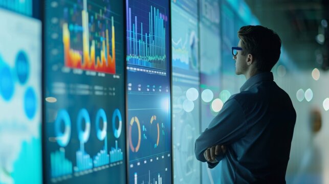Professional businessman analyzing financial data with digital charts and graphs in modern office environment with bokeh lights background.