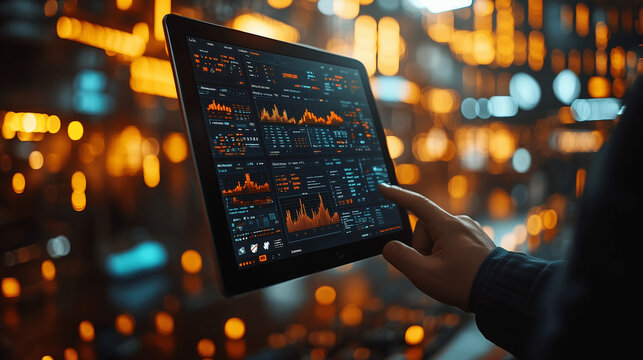 Businessman Analyzing Complex Data Sets on a Tablet in a High-Stakes, Fast-Paced Stock Market Scenario with Dynamic Lighting and Energetic Background. Perfect for Financial and Technology Industry.