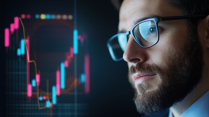 Confident businessman with glasses looking ahead, standing against a backdrop of dynamic stock market charts in a dimly lit environment