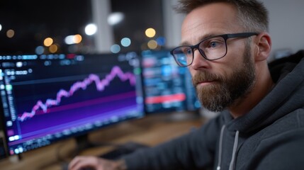 individual is focused on analyzing stock market trends during the night in a well-lit office. Multiple computer screens showcase dynamic financial charts and data
