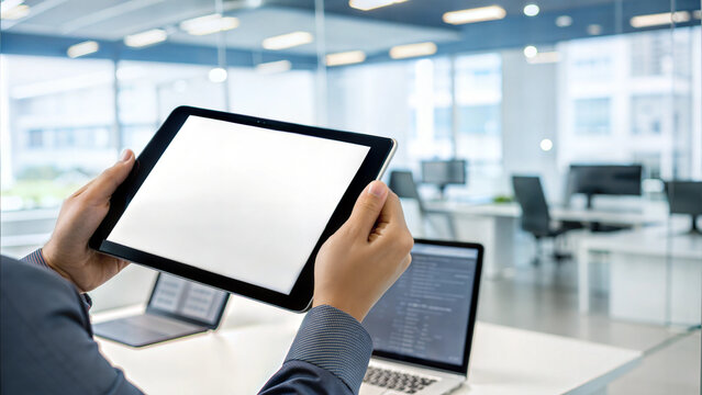 Businessman using a digital tablet with blank screen in a modern open office setting
