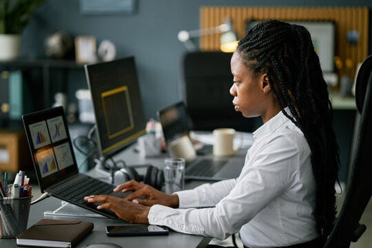 Focused Businesswoman Analyzing Data On Computer Screen Images