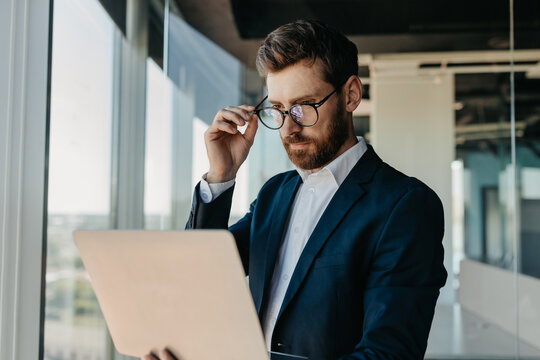 Focused businessman looking at laptop computer, working in modern office, reading emails from his business partners