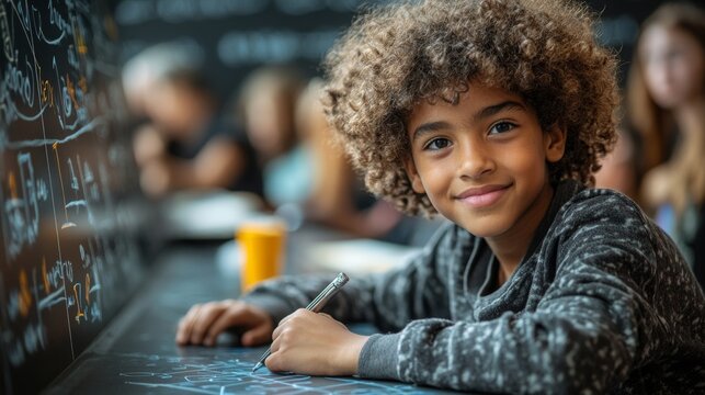 Boy Solving Problems in Front of Math Wall